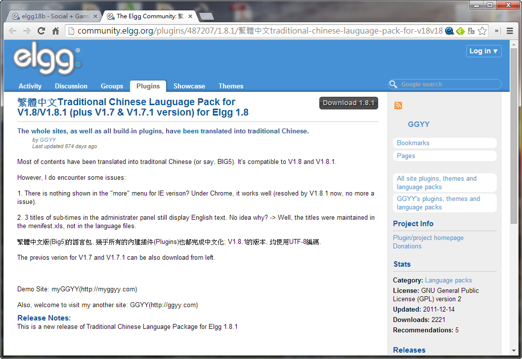 繁體中文Traditional Chinese Lauguage Pack for V1.8/V1.8.1 (plus V1.7 & V1.7.1 version) for Elgg 1.8
