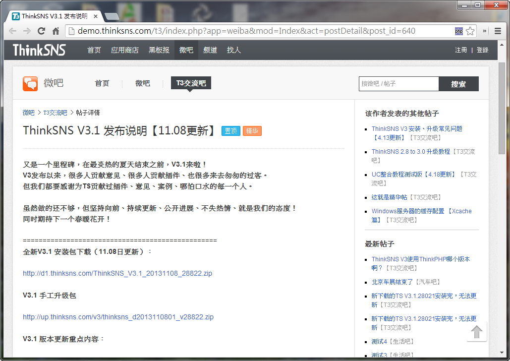 http://demo.thinksns.com/t3/index.php?app=weiba&mod=Index&act=postDetail&post_id=640